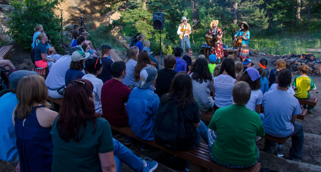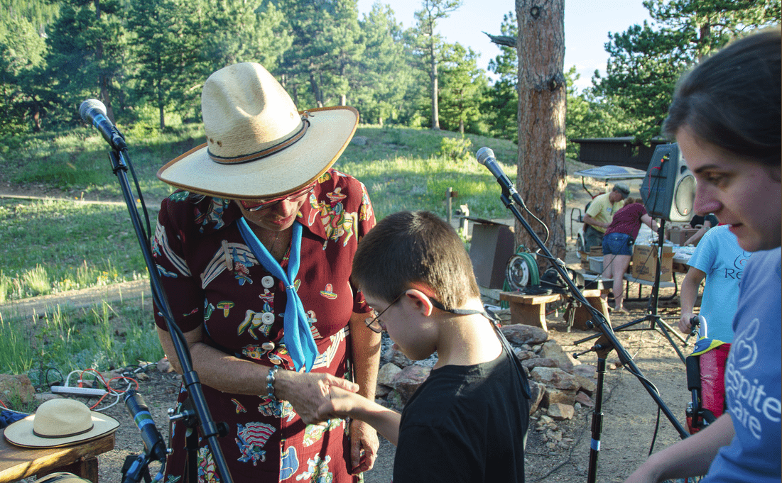 “Write and perform a song for Chase the Music. This is a wonderful, heart‐warming project created by Clark Hodge, who matches up children in need of care with musicians and composers who create a piece of music celebrating the child or children. The project I was involved with was to write a song for Respite Care kids who attend a week‐long camp at the Highlands Presbyterian Camp in Allenspark. My dear Blue Prairie friends Jani and Zeke Little played the show with me and it was one of the most emotionally rewarding performances I have ever done. There were other campers there as well, and everybody celebrated everybody! There was dancing, swaying, and singing along, and the cakes were beautifully made, featuring the name of the new song, Sweet Saddle Pals. Thank you so much, Clark, for including me in your project, and thanks Jani and Zeke for playing the show! I will carry the joy of this project with me forever.”